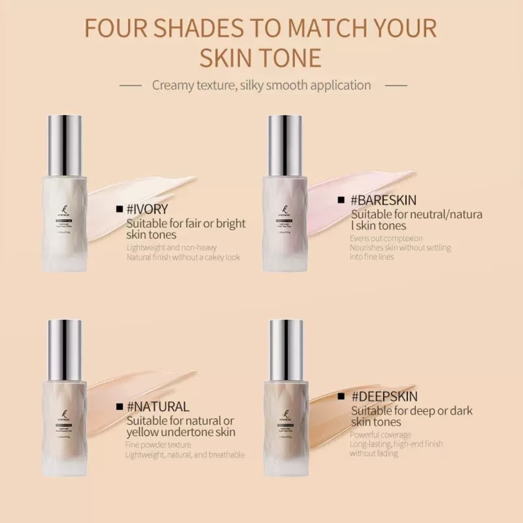 #Ivory: Suitable for fair or bright skin tones — lightweight and non-heavy with a natural finish