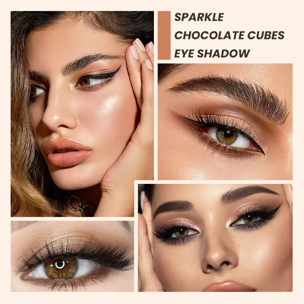 What makes our Chocolate Cubes special? The formula is designed to be shining and dazzling — delivering brilliant color payoff with a luminous finish that catches the light beautifully. And the beauty lasts: these shadows are persistent, staying vibrant and crease-free throughout your longest days.