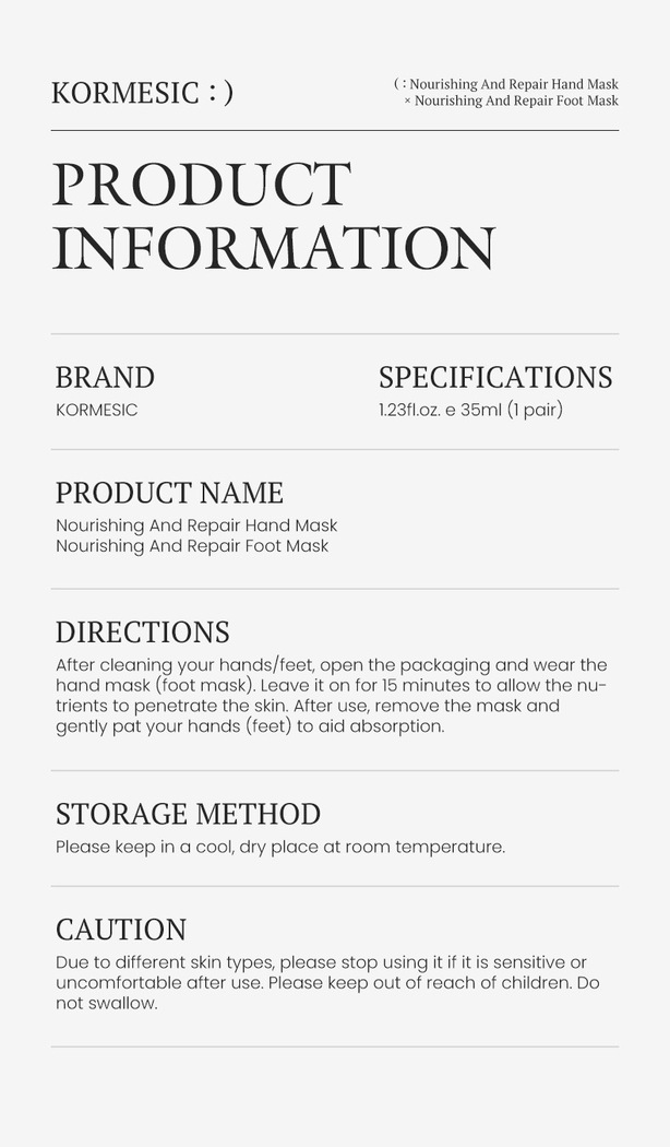 The hand masks feature touchscreen-friendly fingertips, allowing you to use your phone while treating your hands. The foot masks are ergonomically cut to fit perfectly and stay in place while walking. Both masks are crafted from skin-friendly, deeply hydrating fabric with tightly stitched edges that enhance essence absorption without stuffiness.
