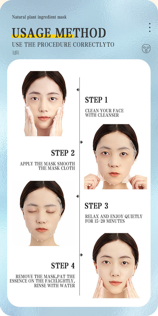 Apply: Unfold the sheet mask and gently smooth it over your face, avoiding the eye and lip area.
